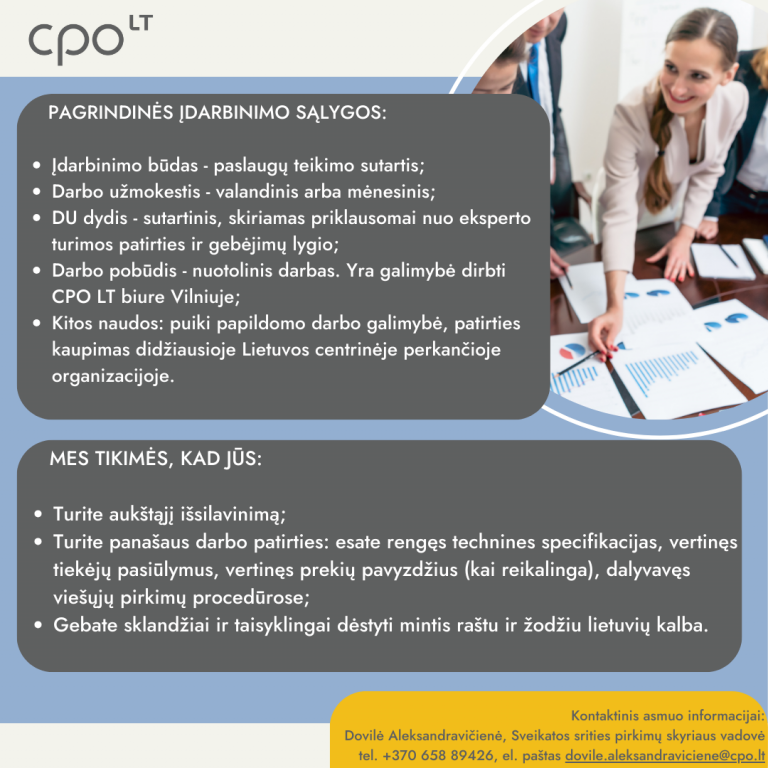 Nacionalinė perkančioji organizacija CPO LT jau daugiau nei 10-metį kaupia centralizuotų viešųjų pirkimų patirtį bei yra sutelkusi aukščiausios kompetencijos profesionalus, kurių didžioji dalis turi didesnę nei 5-erių metų patirtį viešuosiuose pirkimuose. Kviečiame prisijungi prie mūsų augančios ambicingos komandos!