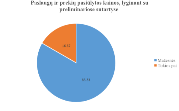 Tiek perkančiosioms organizacijoms, tiek ir CPO LT yra labai svarbu žinoti, ar konsoliduotų pirkimų vykdymas, lyginant su paprastais pirkimais leidžia taupyti viešojo sektoriaus lėšas. Todėl tiekėjų buvo klausiama, ar jie atnaujintam varžymuisi siūlė mažesnes kainas, nei preliminarioje sutartyje, 83,33 proc. apklaustųjų nurodė, kad pateikė mažesnes kainas, 16,67 proc. – tokias pat (2pav.)