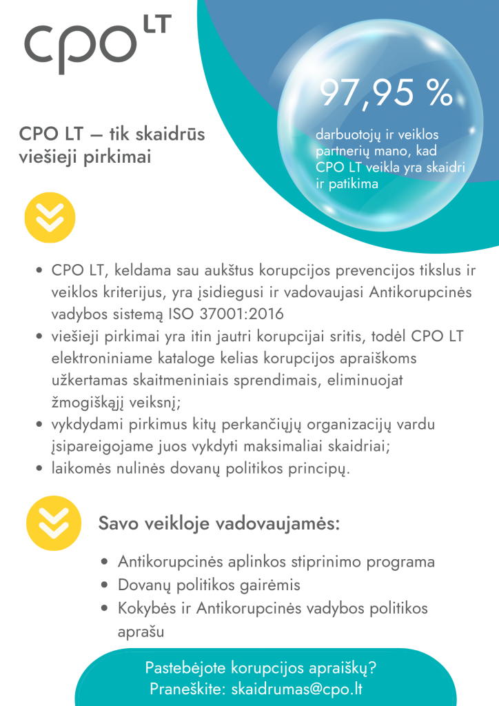 CPO LT primena, kad skaidrumo siekis yra neatsiejamas nuo visų suinteresuotųjų šalių bendradarbiavimo. Pastebėję galimas korupcijos ar neskaidraus elgesio apraiškas, kviečiame pranešti: skaidrumas@cpo.sprendimai.cloud arba telefonu +370 666 29097