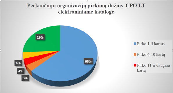 Respondentų atsakymai rodo, kad net 63 proc. švietimo įstaigų perkančiųjų organizacijų perka 1-5 kartus, o dažniau (6 ir daugiau kartu) perka vos 7 proc. jų. Tačiau gana didelis skaičius perkančiųjų organizacijų (26 proc.) nurodė, kad iš viso nepirko joms būtinų reikmenų per CPO LT kanceliarinių prekių modulį (1pav.).