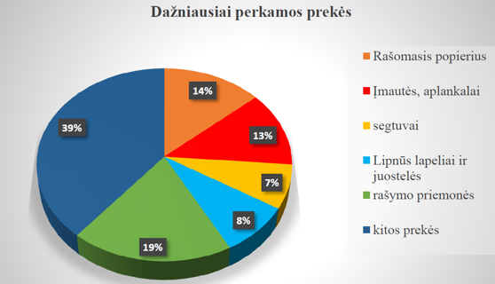 Apklausos rezultatai rodo, kad populiariausios kanceliarinių prekių segmento prekės nesikeičia. Tai rašymo priemonės, rašomasis popierius, įmautės ir aplankalai, segtuvai ir lipnūs lapeliai ir juostelės. Šios prekės sudaro 61 proc. visų įsigyjamų prekių, o likusioms 42 prekių grupėms tenka 31 proc. pirkimų (3pav.).